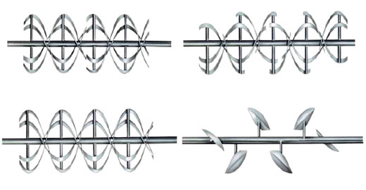 HTM型螺条式混合机主要有传动部件、筒体、筒盖、特殊布置的螺条主轴、出料阀等组成。该螺条式混合机由电机经减速机驱动特殊布置的螺条主轴旋转,中心出料时外部的螺条将物料移到中心位置,内部的螺条将物料推向端板,两股物料作相互扩散、对流、剪切、错位和辐射状运动,从而使物料在极短的时间内达到混合均匀的效果。根据物料特性可选用--连续式螺条、断续式螺条和桨叶式螺条。三种螺条根据出料点不同可以排列成中心和端部卸料两种形式。