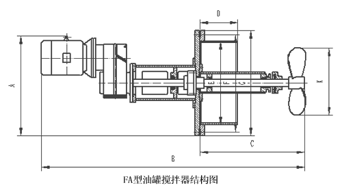 侧向伸入式搅拌机是由储罐的侧壁伸入罐内,它通过法兰盖与罐体的开口法兰相联结。搅拌机的桨叶为船用螺旋桨型。由于螺旋桨的转动,使罐内液体产生两个方向的运动,一个沿着螺旋桨轴线方向向前运动,另一个沿螺旋桨圆周方向的运动。轴线方向的运动,由于受到罐壁的阻碍而使罐内液体沿着罐壁作圆周方向的运动,而液体沿螺旋桨圆周方向的运动,就使罐内液体上下翻动,这样就使罐内液体得到搅拌,并可防止罐内沉积物的堆积。